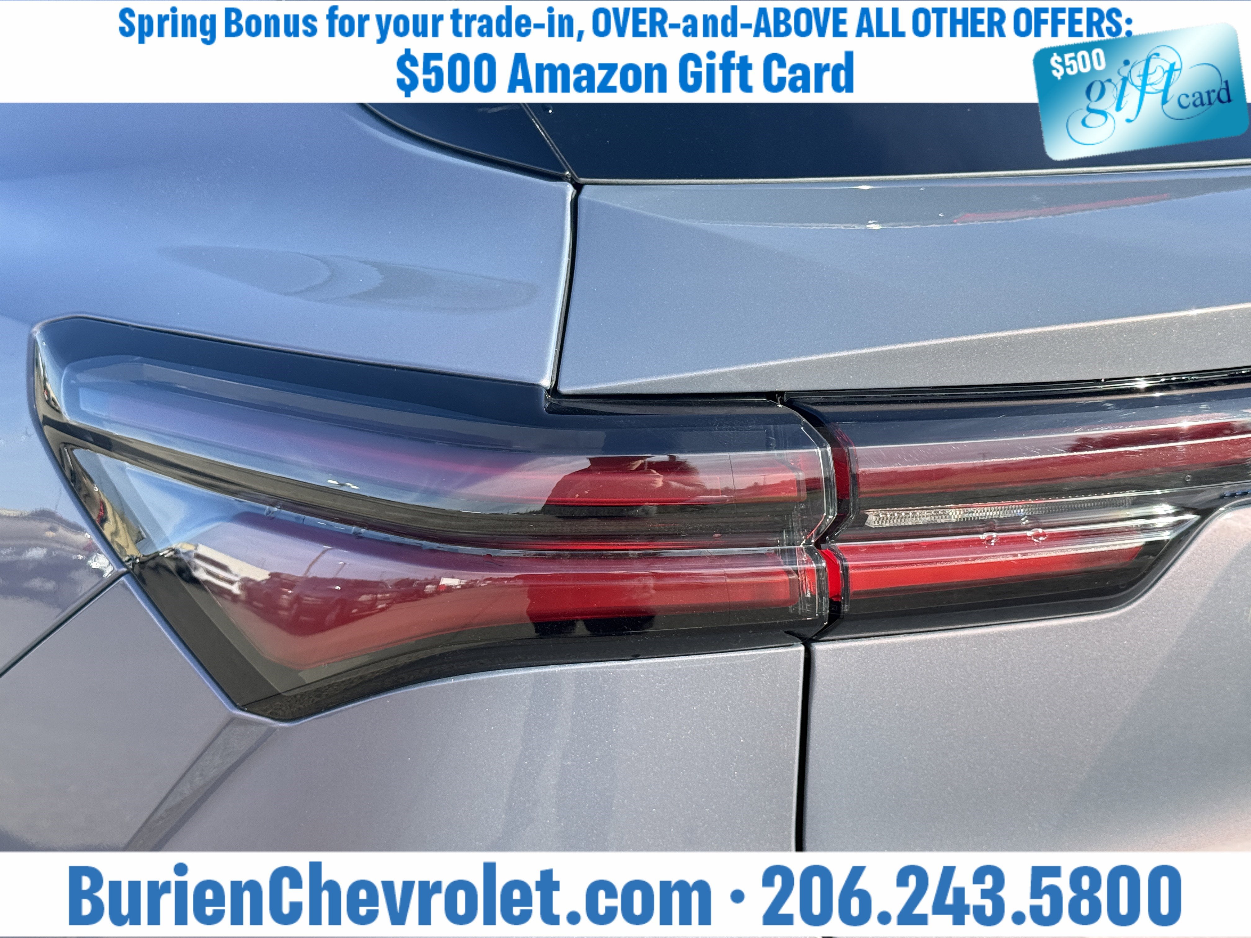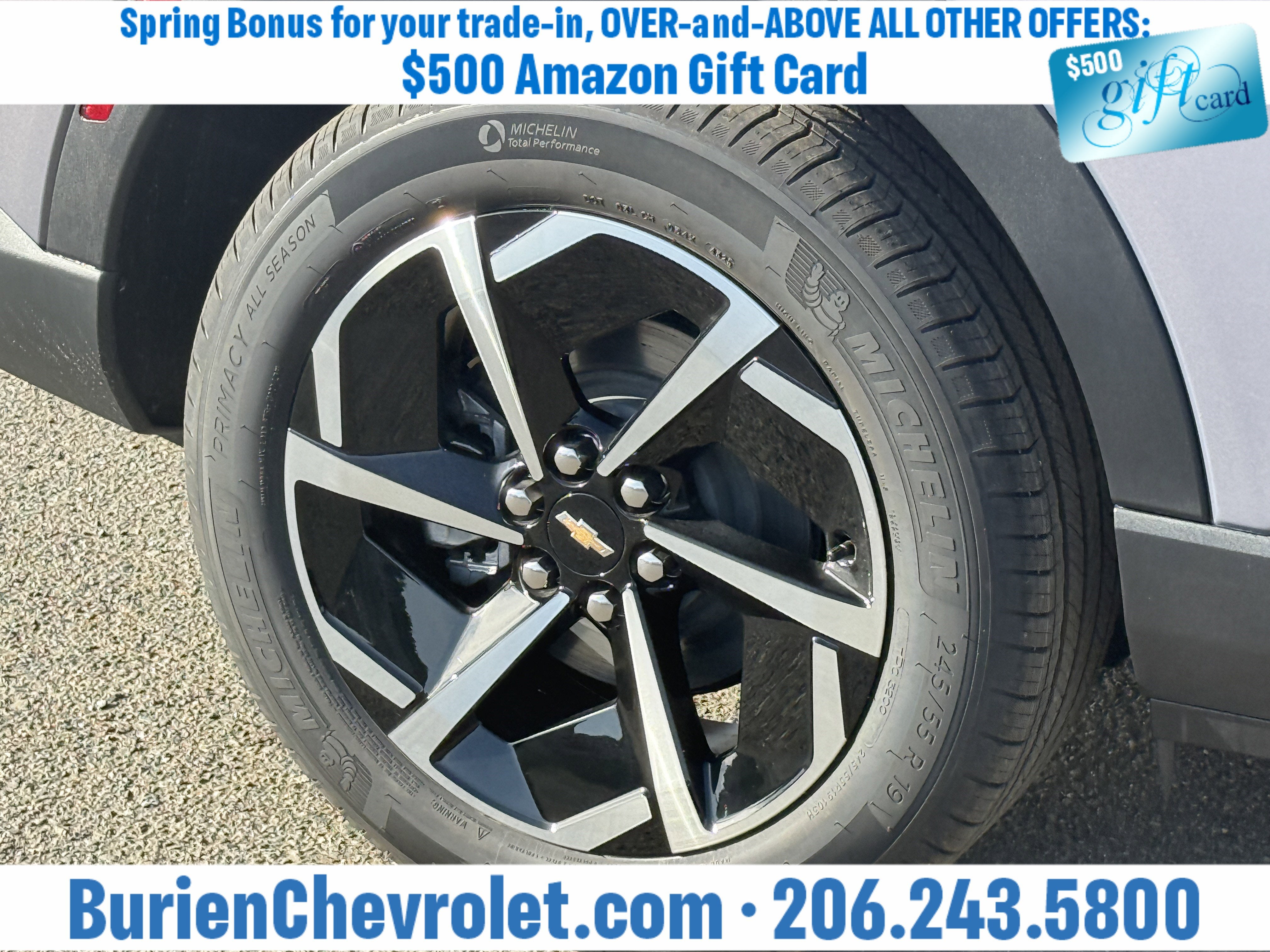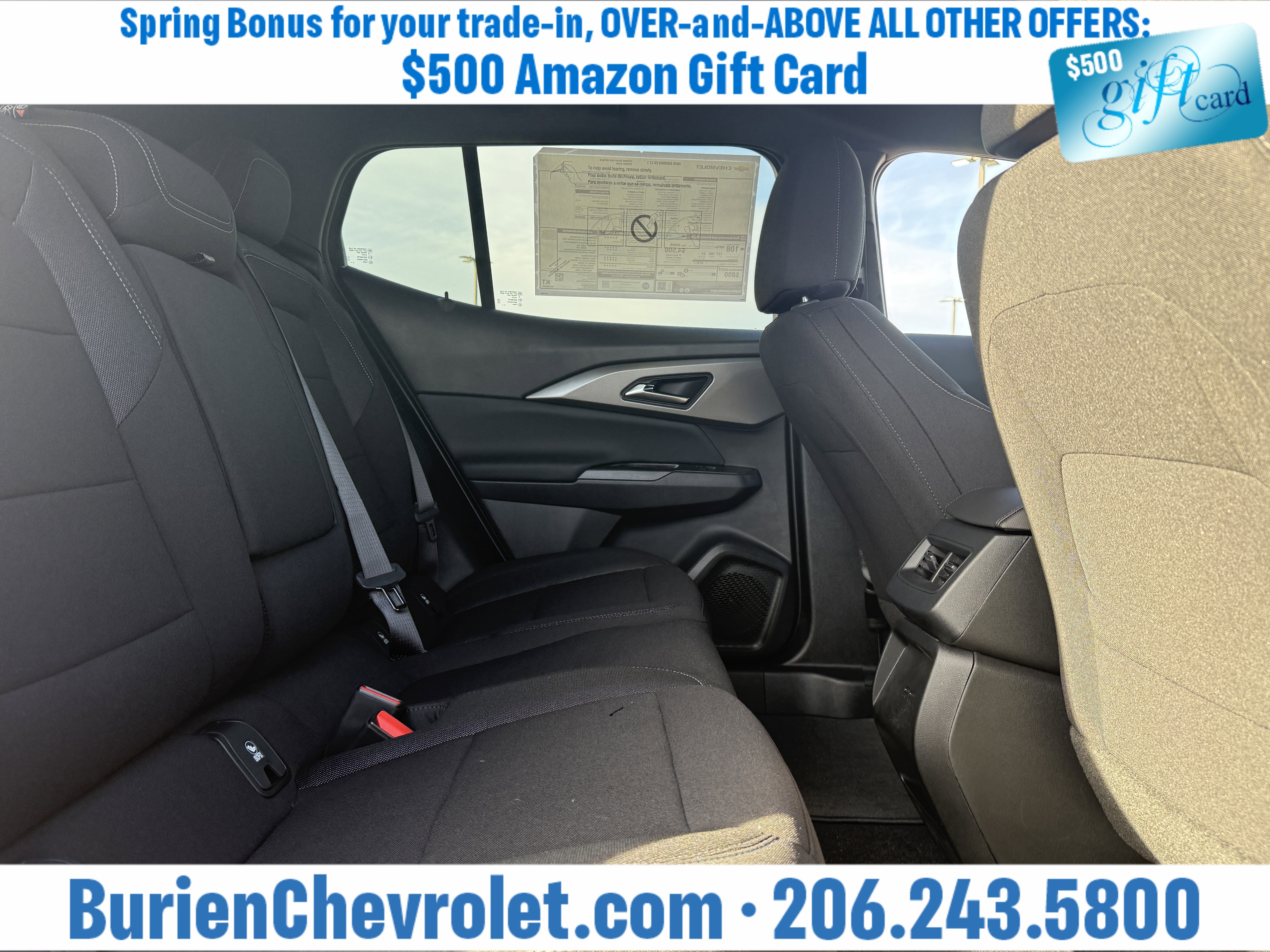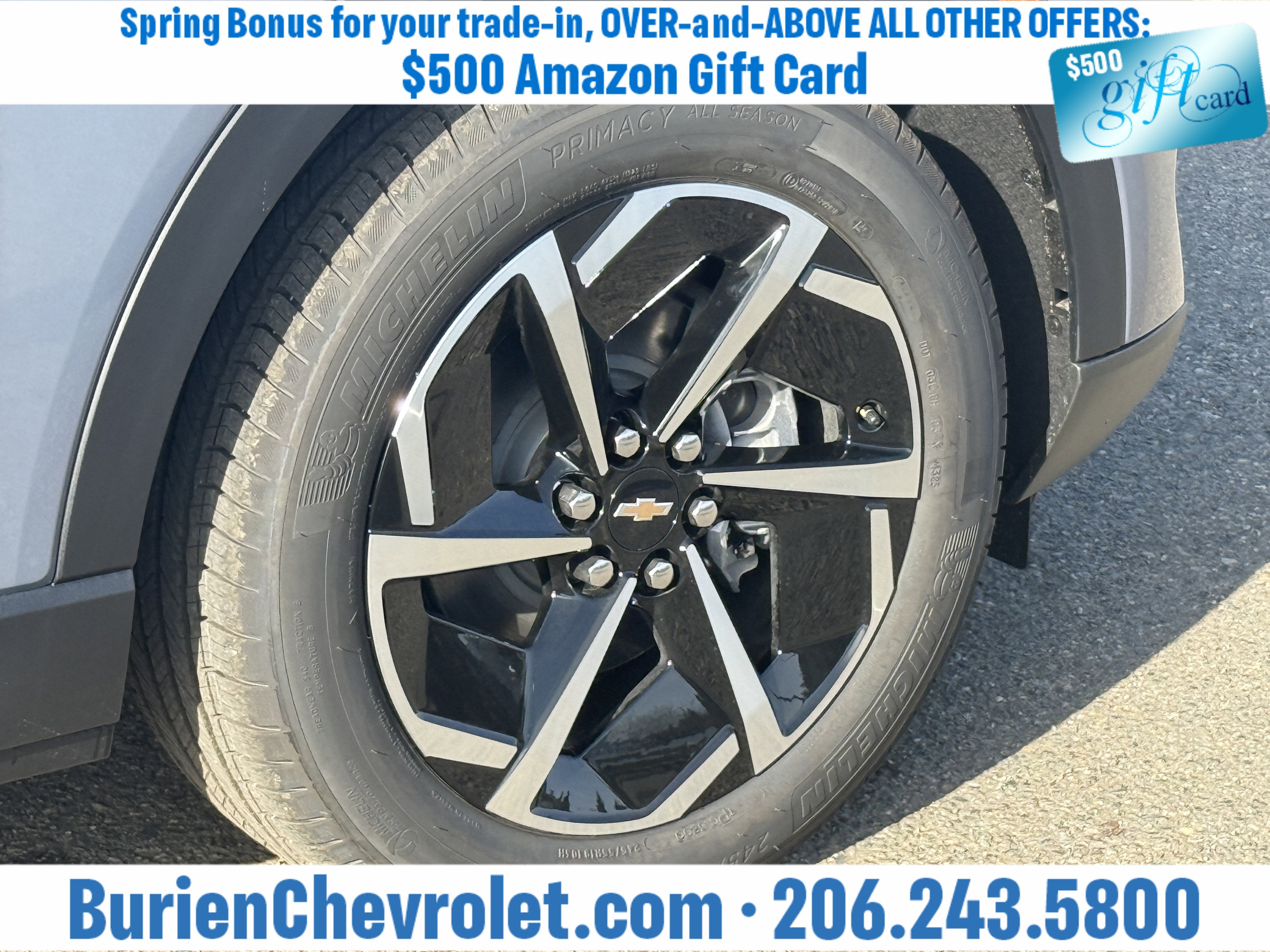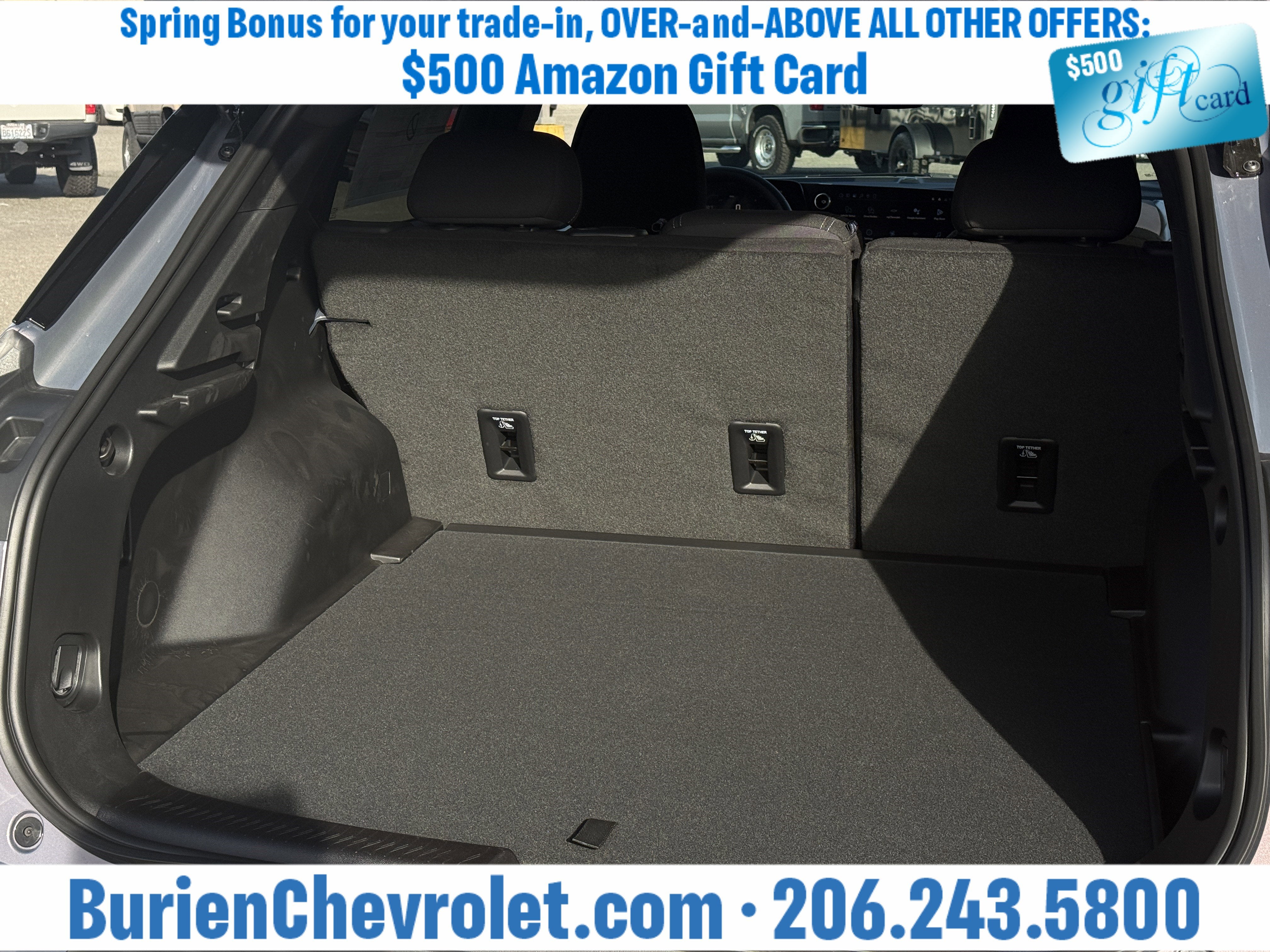 Prices for vehicles as equipped do not include charges such as: License, Title, Registration Fees, State or Local Taxes, Finance Charges, Credit Investigation, Optional Credit Insurance, Physical Damage or Liability Insurance, Delivery Fees, or a negotiable $200 Documentary Services Fee. All photos and graphics for illustration purposes only. Where actual vehicle photos are not available, stock image representations may be displayed. Prototype features or options may be displayed. Dealership makes no representations, expressed or implied, to any actual or prospective purchaser or owner of vehicles as to the existence, ownership, accuracy, description or condition of vehicles' listed equipment, accessories, price or any warranties. Prices may include dealer installed options. Any and all differences must be addressed prior to the sales transaction. The Employee Discount for Everyone is not compatible with Lease offers. See Burien Chevrolet for details.