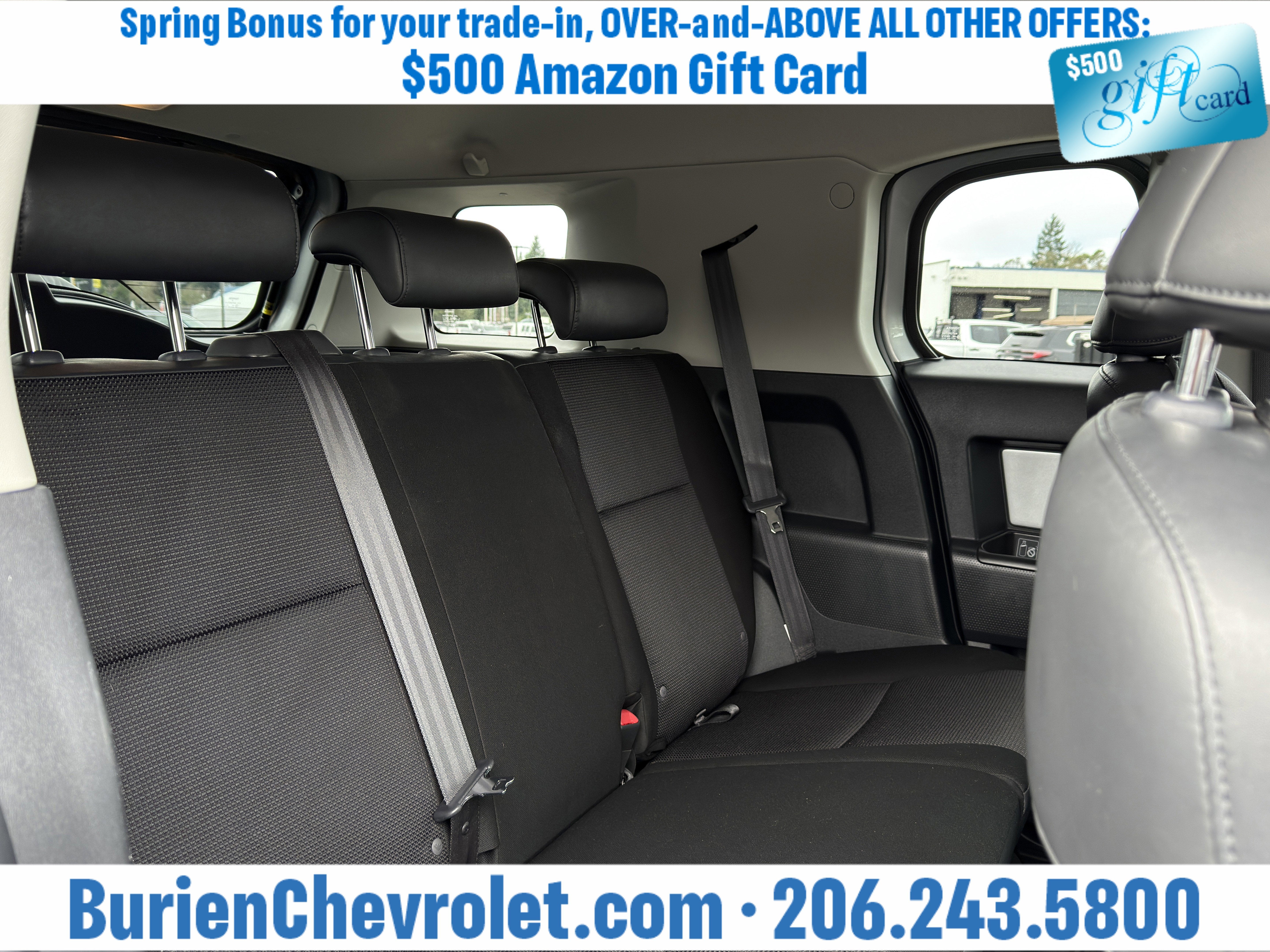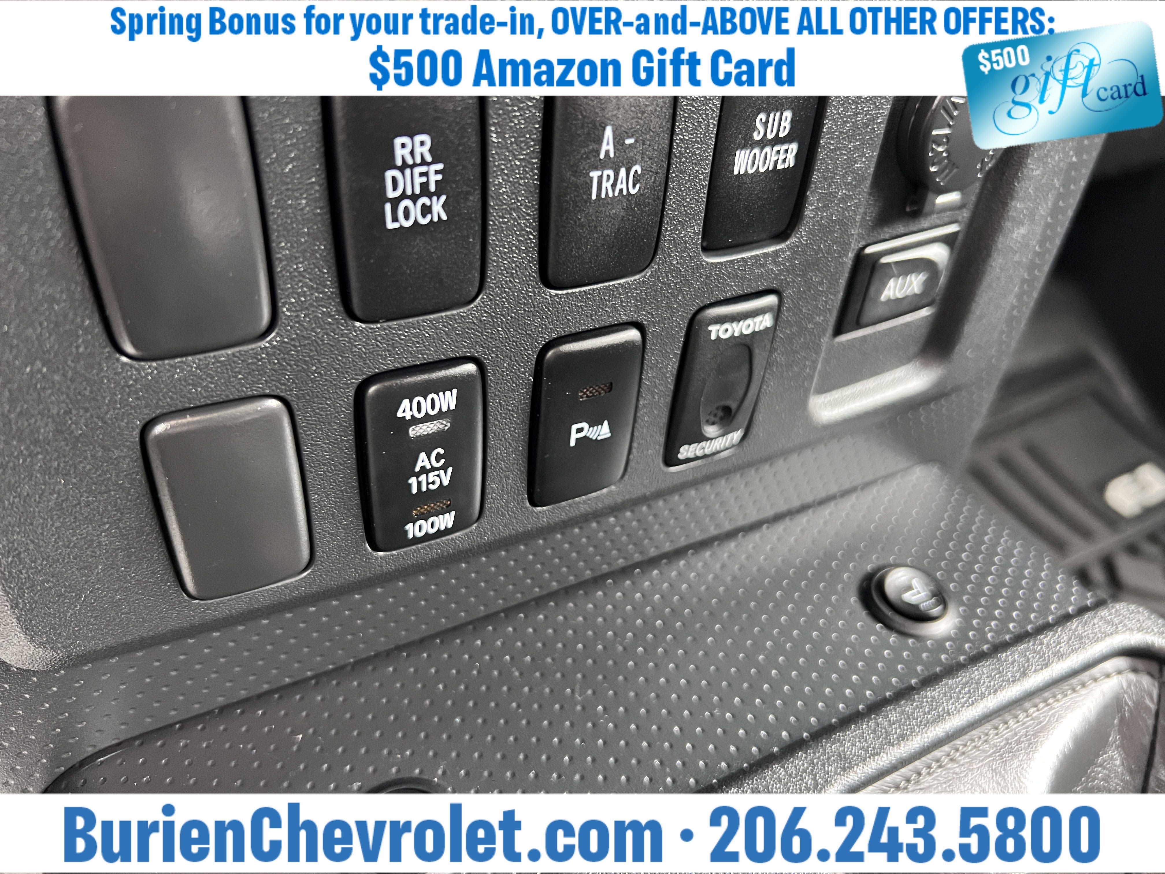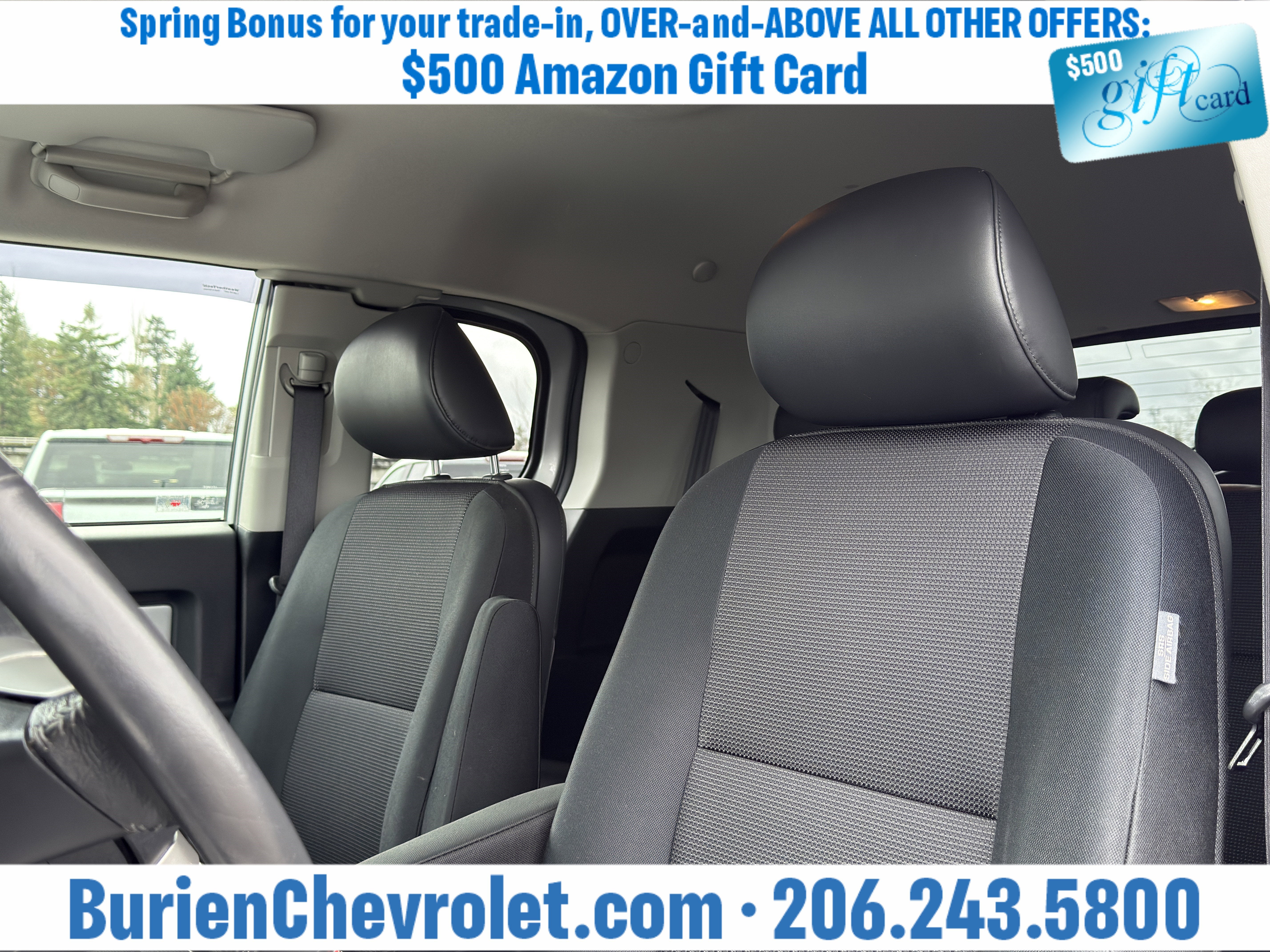 Prices for vehicles as equipped do not include charges such as: License, Title, Registration Fees, State or Local Taxes, Finance Charges, Credit Investigation, Optional Credit Insurance, Physical Damage or Liability Insurance, Delivery Fees, or a negotiable $200 Documentary Services Fee. All photos and graphics for illustration purposes only. Where actual vehicle photos are not available, stock image representations may be displayed. Prototype features or options may be displayed. Dealership makes no representations, expressed or implied, to any actual or prospective purchaser or owner of vehicles as to the existence, ownership, accuracy, description or condition of vehicles' listed equipment, accessories, price or any warranties. Prices may include dealer installed options. Any and all differences must be addressed prior to the sales transaction. The Employee Discount for Everyone is not compatible with Lease offers. See Burien Chevrolet for details.