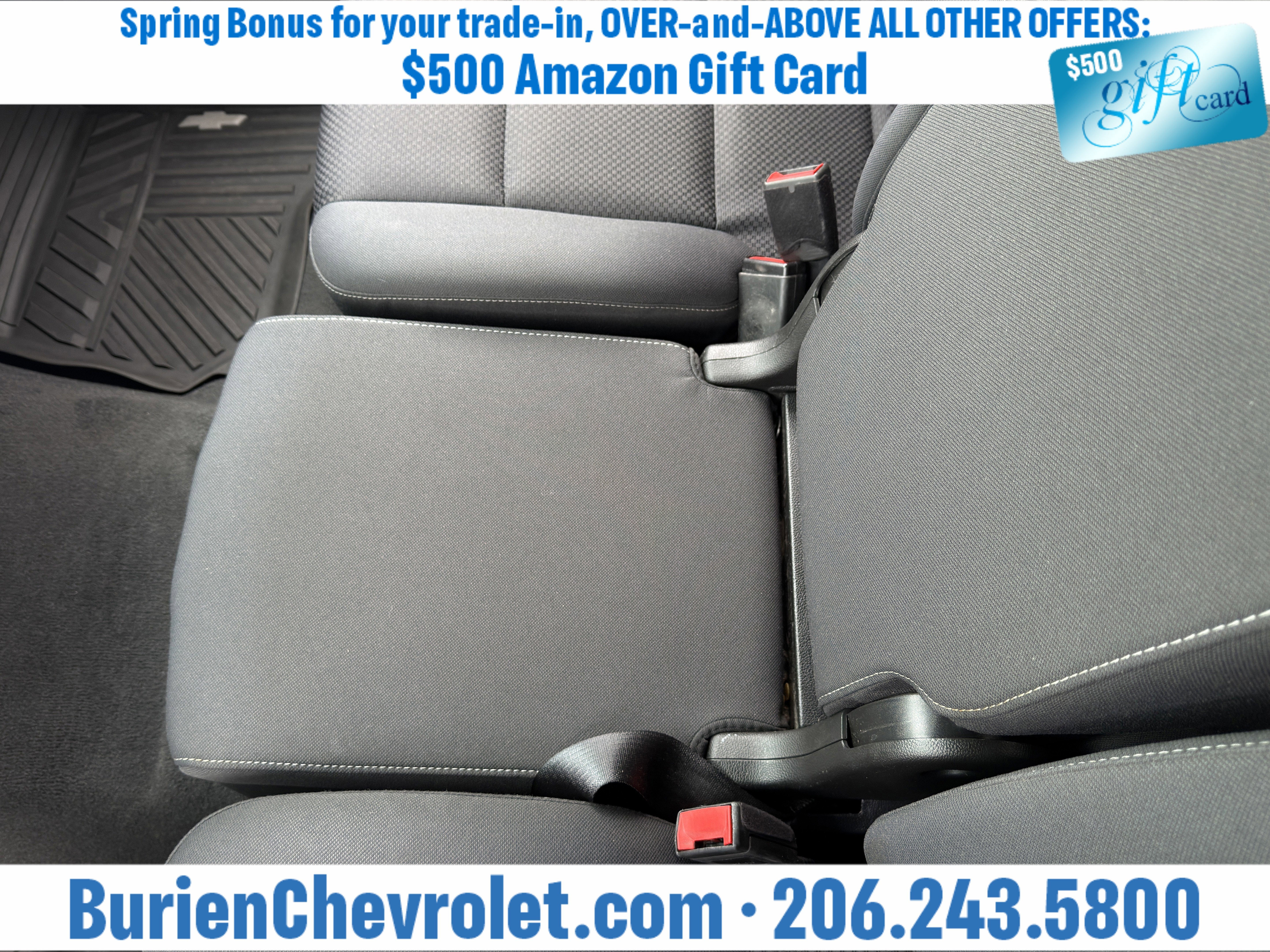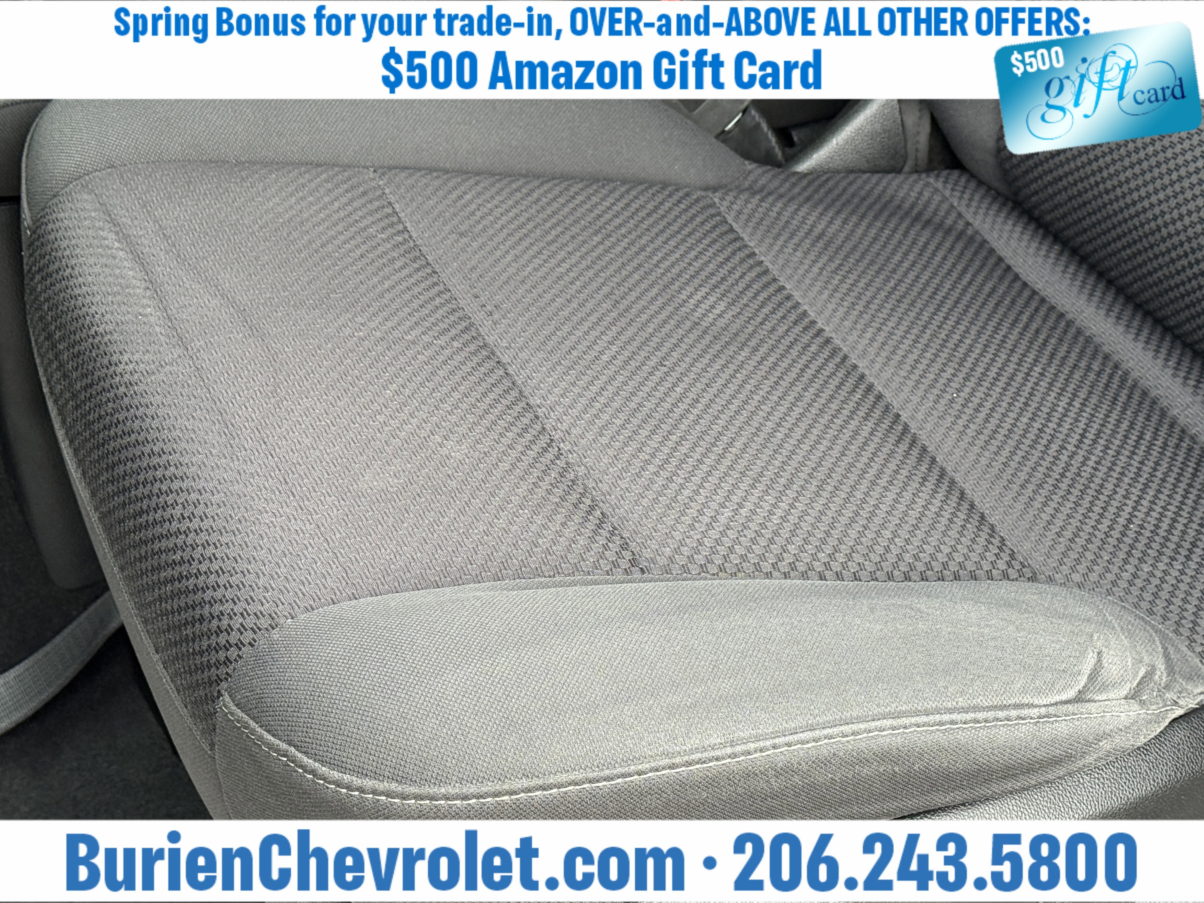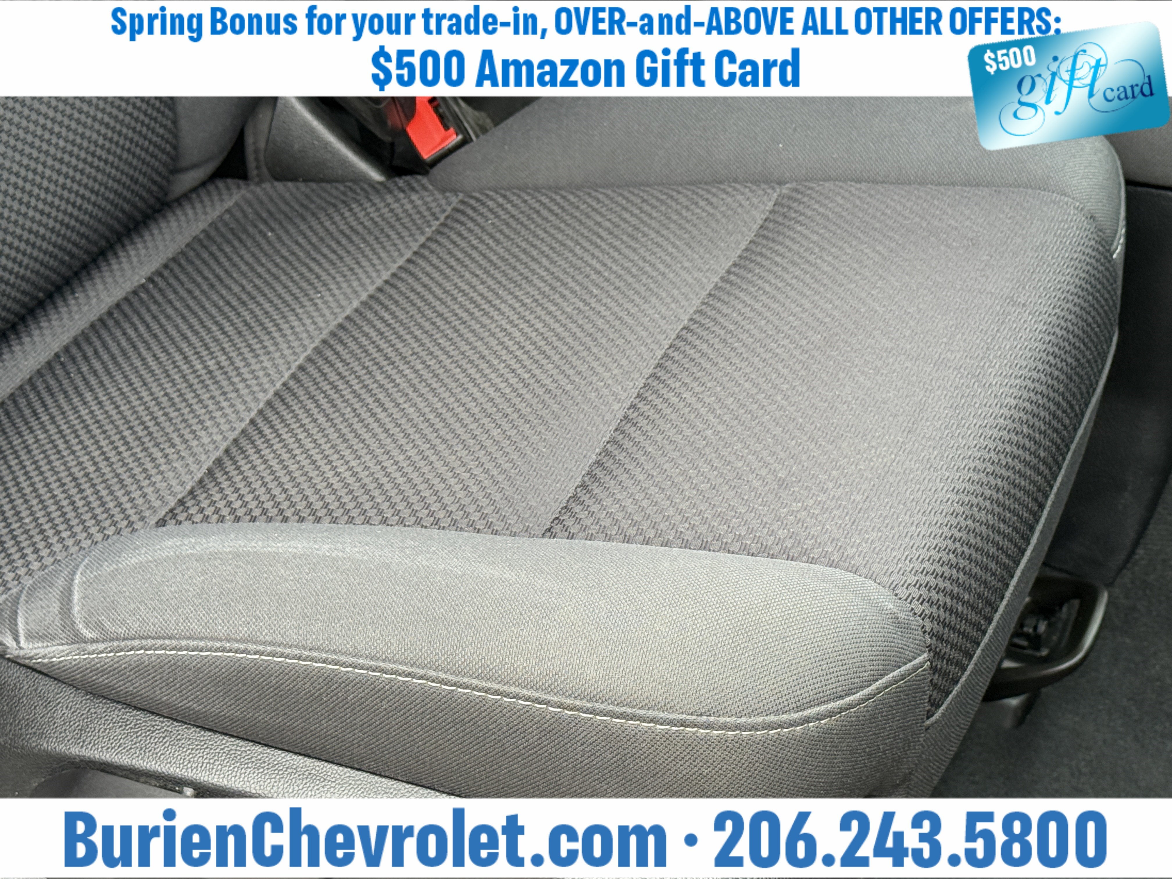 Prices for vehicles as equipped do not include charges such as: License, Title, Registration Fees, State or Local Taxes, Finance Charges, Credit Investigation, Optional Credit Insurance, Physical Damage or Liability Insurance, Delivery Fees, or a negotiable $200 Documentary Services Fee. All photos and graphics for illustration purposes only. Where actual vehicle photos are not available, stock image representations may be displayed. Prototype features or options may be displayed. Dealership makes no representations, expressed or implied, to any actual or prospective purchaser or owner of vehicles as to the existence, ownership, accuracy, description or condition of vehicles' listed equipment, accessories, price or any warranties. Prices may include dealer installed options. Any and all differences must be addressed prior to the sales transaction. The Employee Discount for Everyone is not compatible with Lease offers. See Burien Chevrolet for details.
