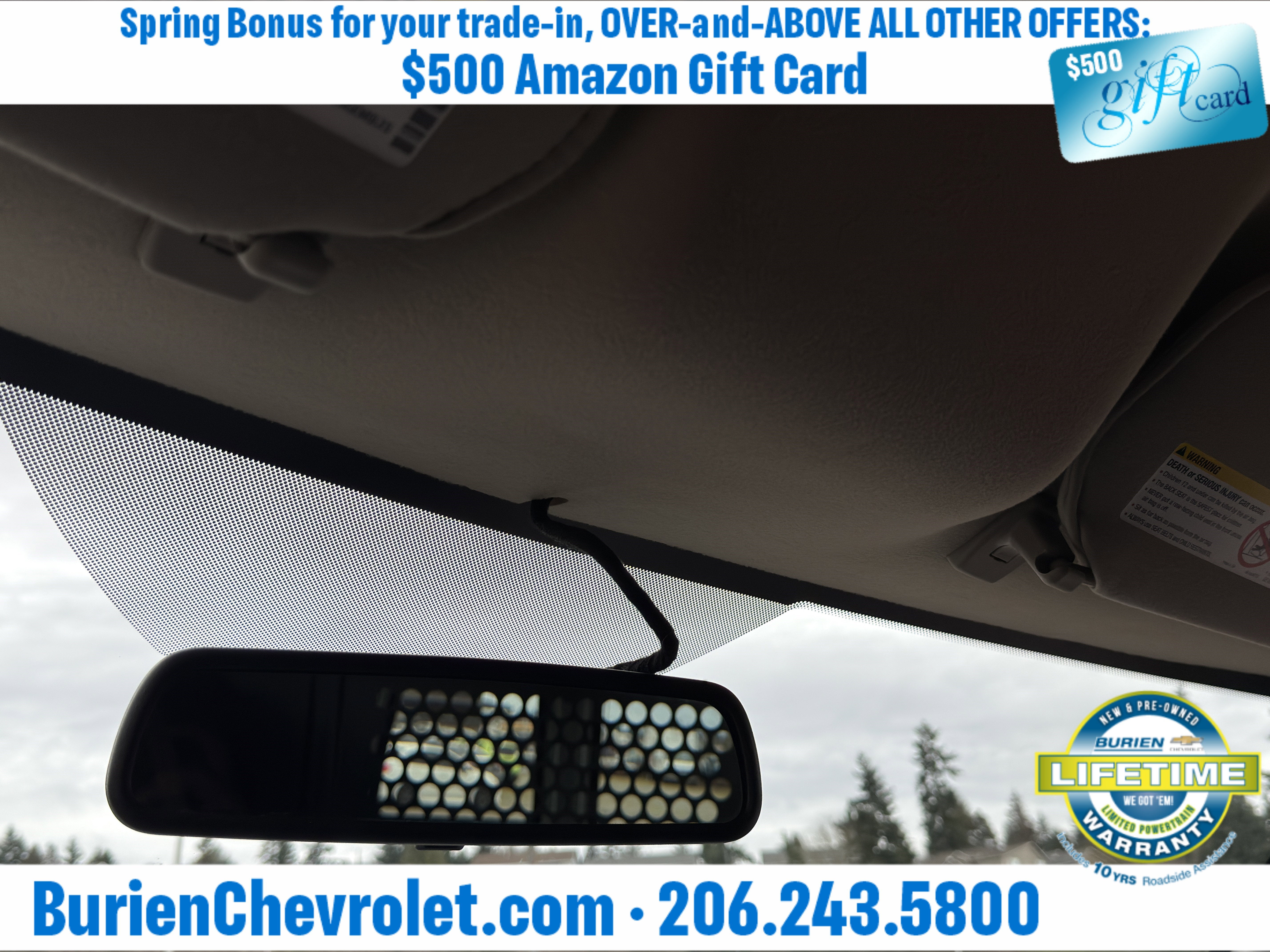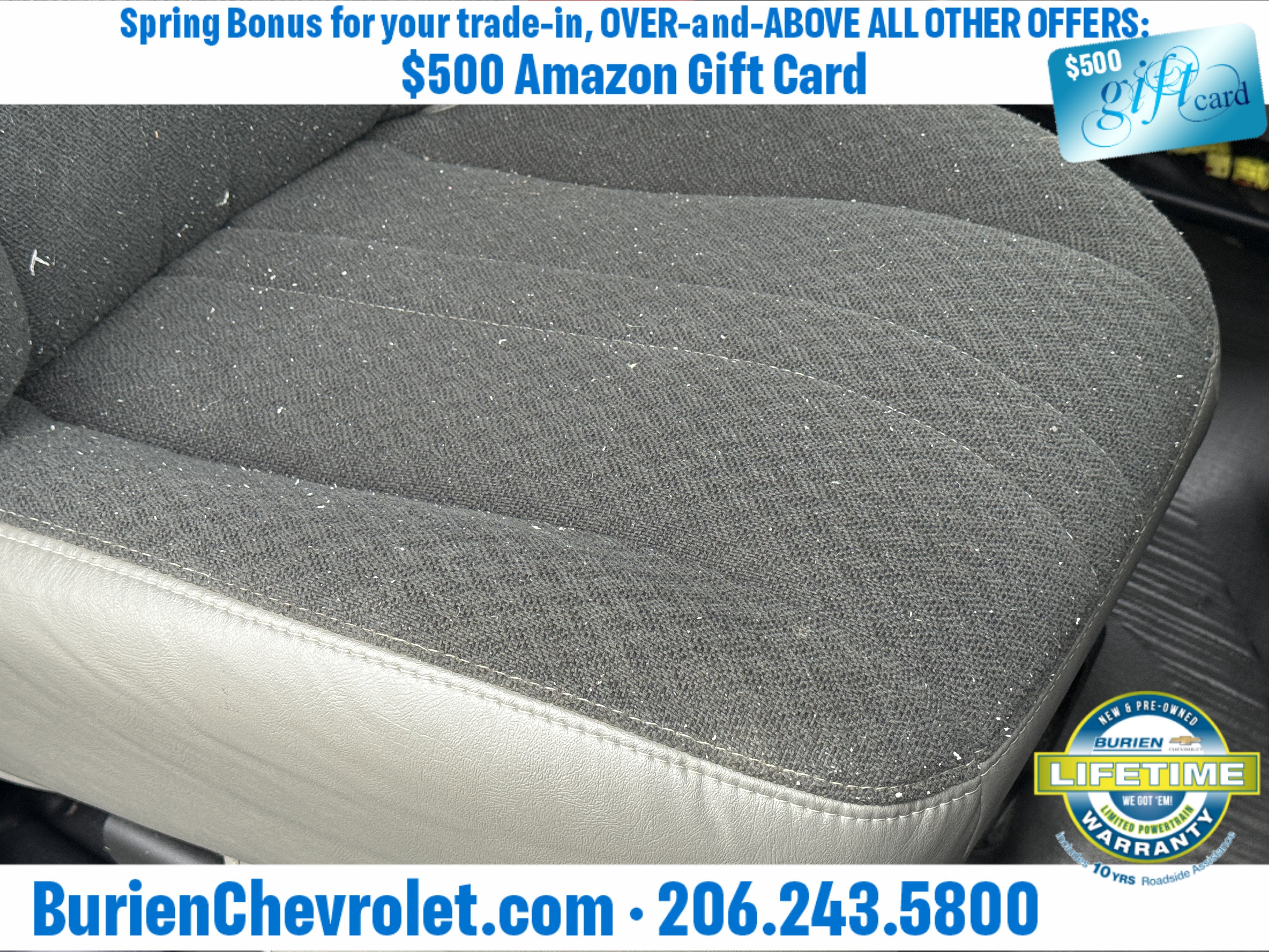 Prices for vehicles as equipped do not include charges such as: License, Title, Registration Fees, State or Local Taxes, Finance Charges, Credit Investigation, Optional Credit Insurance, Physical Damage or Liability Insurance, Delivery Fees, or a negotiable $200 Documentary Services Fee. All photos and graphics for illustration purposes only. Where actual vehicle photos are not available, stock image representations may be displayed. Prototype features or options may be displayed. Dealership makes no representations, expressed or implied, to any actual or prospective purchaser or owner of vehicles as to the existence, ownership, accuracy, description or condition of vehicles' listed equipment, accessories, price or any warranties. Prices may include dealer installed options. Any and all differences must be addressed prior to the sales transaction. The Employee Discount for Everyone is not compatible with Lease offers. See Burien Chevrolet for details.